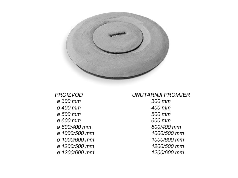 U našem asortimanu možete pronaći betonske poklopce s jednom ručkom. Namjeravana uporaba građevnog proizvoda, u skladu s primjenjivim usklađenim tehničkim specifikacijama: zatvaranje vertikalno postavljenih betonskih cijevi istog promjera (septičke jame, bunari, šahtovi).