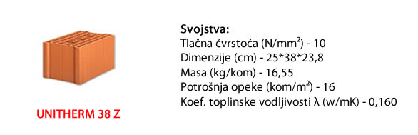 Termoizolacijski blok opeka za vanjske nosive zidove debljine 38 cm. Velika termoizolacijska moć ova opeka osigurava dobru termičku zaštitu već kao monolitni zid bez dodatnih termoizolacijskih slojeva.