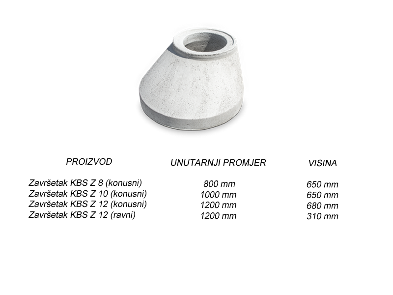 Izrađen postupkom vibroprešanja od prirodnog agregata, cementa i dodataka. Osigurava potpuno vodonepropusan kanalizacijski sustav te se jednostavno i brzo ugrađuje. Namjeravana uporaba građevnog proizvoda, u skladu s primjenjivim usklađenim tehničkim specifikacijama: reduciranje s promjera Ø 800 mm na promjer željeznog lijevanog poklopca Ø 600 mm.