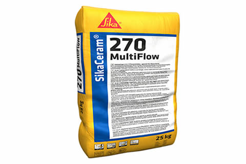 SikaCeram 270 MultiFlow IT je deformabilno, jednokomponentno ljepilo na bazi visoko kvalitetnog cementa, visokog udjela polimera, mineralnog punila i aditiva. Služi kao deformabilno ljepilo za slojeve do 30 mm debljine za polaganje pločica od gres porculana i prirodnog kamena na fasade, podove s podnim grijanjem, bazene za plivanje, industrijske podove i sl. Klasa C2 FTE S1 prema EN 12004, za tiksotropnu konzistenciju. Klasa C2 FE S1 prema EN 12004 za tekuću konzistenciju.