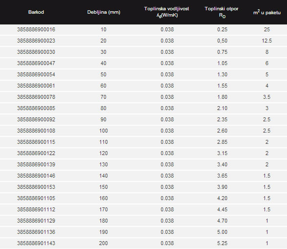 Koeficijent toplinske provodljivosti λd: 0,038 W/mK