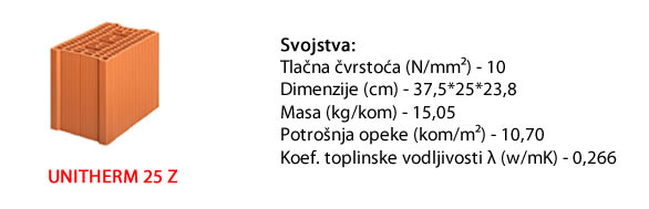 Termoizolacijski blok opeka za vanjske i unutarnje nosive zidove debljine 25 cm. Poboljšanih termoizolacijskih svojstva ova opeka ujedinjuje visoku čvrstoću i nosivost sa izolacijom kako zvuka tako i topline.