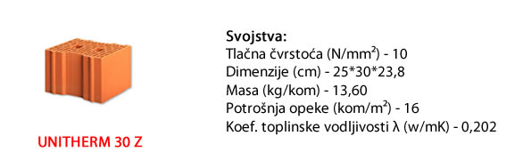 Termoizolacijski blok opeke za vanjske nosive zidove dimemenzije 30 cm. Spajanje blokova sistemom mortnog utora osigurava brzu gradnju, visoku protupotresnu nosivost te odlična termoizolacijska svojstva.